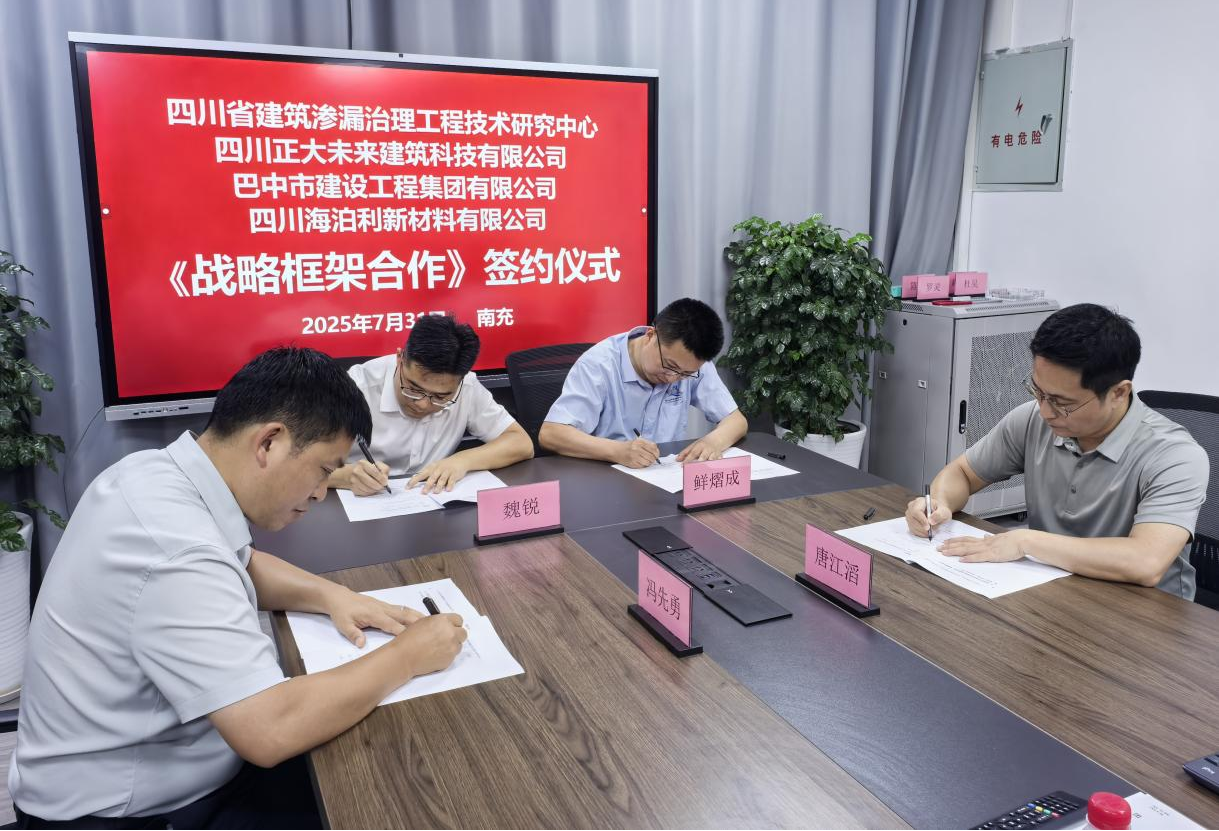 2025年7月31日,建工集团与四川正大未来建筑科技有限公司、四川海泊利新材料有限公司在南充市签订《战略框架合作协议》。四方聚焦绿色建材产业链升级与建筑渗漏治理体系创新,开启“产学研用”深度协同的新征程。